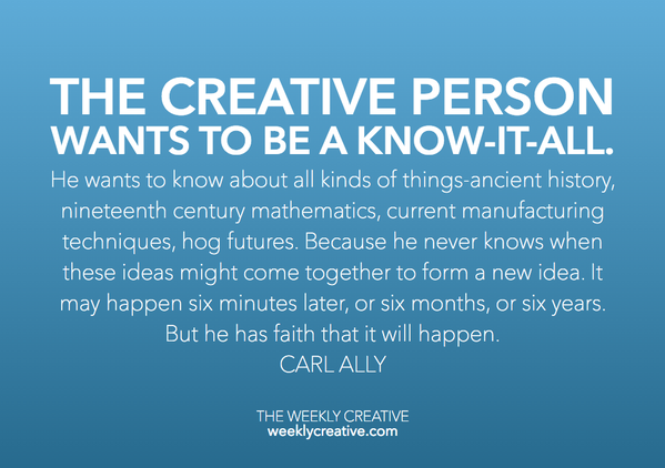 The creative person wants to be a know -it -all. He wants to know about all kinds of things: ancient history, nineteenth -century mathematics, current manufacturing techniques, flower arranging, and hog futures. Because he never knows when these ideas might come together to form a new idea. It may happen six minutes later or six months, or six years down the road. But he has faith that it will happen. – Carl Ally